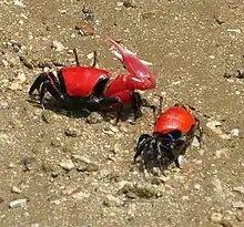 Paraleptuca chlorophthalmus, is a common fiddler crab found in the mangroves of East Africa, from Somalia to South Africa, as well as Madagascar and Mauritius.[3] Marsh fiddlers dig burrows in the muddy or sandy banks of salt marshes, which they use to protect themselves from predators, high tide and extreme temperatures. They feed by filtering detritus out of mud, and defend their burrows against other fiddler crabs. Paraleptuca chlorophthalmus is characterised by its red pereiopods and blue and black markings on its carapace.