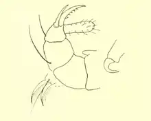| Details of a large palp (centre), which is the species' distinguishing feature. Also shown are a tarsal claw (right) and the mandibles (bottom left). | |