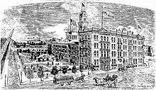 In its initial operation, the hotel was owned by Fred Michel and managed by Rush Field.[12] By May 17, 1879, the hotel was placed in receivership, though it was stated that the hotel would not close.[13] Michel arranged a banquet, later changed to a "grand military prize drill and brass band tournament", to raise funds, dispose of his real estate holdings, and adjust his and the hotel's financial matters. It was to be held on September 16-18, 1879.[14] By late October, a premature statement was made that the hotel would close, though a correction indicated the owners would make changes yet keep it open.[15] In November 1879, furniture and fixtures from the hotel were sold at auction.[16][17] In 1880, Michel proposed renting the vacant hotel at a nominal rate to the government for temporary use, and he offered to donate the park space he owned west of the hotel for a new federal courthouse.[18]