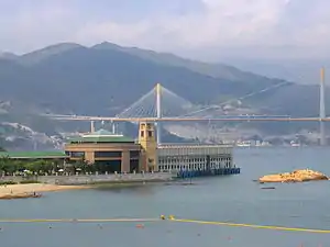 Park Island Ferry Pier on Ma Wan in April 2006. Ting Kau Bridge and the mainland Tsuen Wan District are visible in the background.