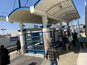 Park Lane station opened on January 10, 1997 as the northern terminus of the Red Line.[2] The station was originally constructed as a ground-level platform located on the southern side of Park Lane. This location was chosen because it did not require the track to cross Park Lane, which would have required grade separation to prevent traffic congestion on the road.[5]