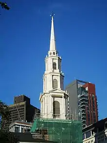 Park Street Congregational Church, founded in 1804, is a historic and active evangelical congregational church in Downtown Boston, Massachusetts, United States. The Park Street Church is a member of the Conservative Congregational Christian Conference. Typical attendance averages over 2,000 people across all Sunday services. Church membership records are private, but the congregation has over 1,200 members.[1][2] The church is located at 1 Park Street, at the corner of Tremont Street.