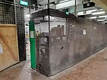 A $3.6 million contract was awarded on December 1, 1976.[42] The 1936-built Temple Place entrance and passageway were closed that month, and concession stands were removed in 1977. The modernization included new wall tiles, new lighting, rebuilt staircases, and upgrades to the faregate area on the southbound platform.[7] The work included the replacement of the remaining original copper headhouses with three modern glass-and-steel structures.[43] Elevators to the fare lobby from the Red Line center platform and the surface were installed in 1979, making the Red Line section accessible.[44] However, the surface elevator was frequently out of service due to repairs and other construction in the station.[45] The aesthetics of the renovation were not well received; one longtime employee remarked the station resembled a billiard parlor.[39]