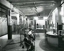 In July 1922, the Boston Transit Commission proposed the addition of a side platform adjacent to the outer northbound streetcar track, with a passageway under Tremont Street leading to two new entrances at Temple Place.[27] Opening the Winter Street Concourse to passengers was also proposed, but was soon rejected by the Department of Public Utilities in favor of continued use as storage space for adjacent businesses.[28] A more ambitious 1927 plan by one of the BERy trustees called for new side platforms on both sides of the streetcar level, with a sub-passage connecting the four streetcar platforms, as well as the Temple Place entrances and Winter Street passageway.[29] In 1933, the two stairway headhouses on the east side of Tremont Street were replaced with low walls, as had previously been done at Scollay Square and Adams Square.[30]
