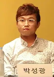 Park Sung-kwang (born August 15, 1981) is a comedian, film director,[1][2] and rapper in the band Brave Guys.[3] He currently performs in KBS's Gag Concert,[4] where he made his entertainment debut as a comedian in 2007. He has owned a kimchi-business since 2012.[5] His previous talent agencies include Top Art Entertainment and SNS Entertainment.[6][7] It had been reported in December 2017 that he was in talks with SM C&C for a new contract,[8] which he signed and SM C&C are now his current agency.[9]