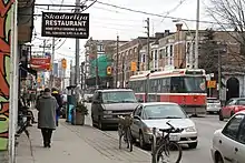 The area has a vibrant storefront commercial strip along Queen Street West that has seen an increase in restaurants and bars in the 2010s, increasing to the point that planning controls were put in place on the opening of new restaurants and bars from 2012.[5]