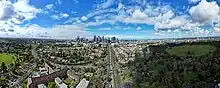 Aerial panorama of Royal Park. The Melbourne skyline sits on the left of the horizon.