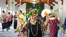 ![]() Mary Ama and the Pacifica Mamas celebrating the Matairangi Mahi Toi arts residency at Government House | |