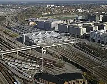 To the west of the Pasila railway station, lower than the platform area, at the current site of Keski-Pasila, was located the former cargo railway yard, officially named the Pasila lower yard.[14] It was located in a valley at whose site was originally located the lake Töölönjärvi, dried up in the 1870s.[15] This railway yard was used for sorting cargo traffic and as a hub point between the Helsinki harbour rail and the Sörnäinen harbour rail. The railway yard was connected to the Finnish Main Line, the Rantarata line and the Ilmala depot. The Sörnäinen harbour rail started directly to the east of the railway yard and a side rail branched off it towards the Pasila machinery yard.