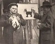 Roscoe Arbuckle holding Lasky Studio cat "Ethel" as model for Pat Sullivan to draw his Felix the Cat for the Paramount Magazine, on page 78 of the 12 March 1921 Exhibitors Herald.
