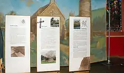 The centre houses exhibitions outlining Kavanagh's life story as well as the history of the surrounding area. It includes a topographical model of the area, a model illustrating Kavanagh's poem, "A Christmas Childhood" paintings, and informational panels on the poet.[7] The Peter Kavanagh hand press is on loan from the Kavanagh Archive University College Dublin.[8] Kavanagh's Death Mask which was formerly owned by John Ryan is also on display. There are many other memorabilia on display including letters, and the font Kavanagh was baptised in.