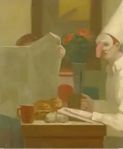 Patrick Webb (born 1955) is an American artist who has portrayed contemporary queer experience through representational narrative paintings.[1][2][3] He is best known for his "Punchinello" paintings, begun in the early 1990s, which feature a gay "everyman" based on the Italian commedia dell'arte stock character, Pulcinella.[4][5][6] Art historians Jonathan D. Katz and Jonathan Weinberg place Webb among artists who that gave voice to the loss and grief associated with the AIDS epidemic by looking beyond the message-heavy activist art and anti-expressive postmodernism of the 1980s to reinvigorated art-historical narrative traditions.[1][2][7] Writers note his work for its classically influenced technique and pathos in fleshing out fears, fantasies, experiences and social dichotomies between self and Other, individual and collective, personal and sociocultural.[8][9][10] He draws on pictorial strategies from old masters as well as modern artists such as Balthus, Jacob Lawrence, Philip Guston and the magic realist Jared French, building scenarios out of architecturally structured compositions, carefully placed elements and precise gestures.[11][12][13]