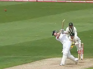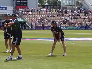 He captained his county club, Durham County Cricket Club, for the final six seasons of his career.[1][2][3] A batting all-rounder, whose batting combined natural strokeplay with great tenacity, Collingwood also bowled reliable medium pace. Described as a "natural athlete", he was regarded as one of the finest fielders of his time, usually fielding at backward point or at third or fourth slip in Tests; he also deputised as wicket-keeper for England.[1][4][5][6]