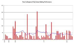 His breakthrough began in 2000, when he was voted Player of the Year by the Durham members, particularly for his one-day efforts.[17] His form varied following a back injury, but he hit his stride in 2001, when he excelled both in the County Championship and in the one-day game.[17] In the six English seasons from 2001, Collingwood has exceeded a batting average of 40 four times and achieved a bowling average of less than 40 on three occasions.[27][28]
