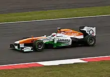 In December 2009, with Fisichella having moved to Ferrari and Liuzzi being promoted to the race team, di Resta took part in a test with the team at the Jerez circuit alongside J. R. Hildebrand.[9] At the Autosport International show in January 2010, he was said to be close to a deal as the team's test and reserve driver for the 2010 season.[10] The deal was announced on 2 February.[11] Di Resta made his Formula One race meeting début at the 2010 Australian Grand Prix, where he took part in the first free practice session in place of Sutil[12] and finished 11th.[13] He drove in the first practice session of all the following races until the Monaco Grand Prix where he did not take part. He resumed driving for the team at the European Grand Prix and the following British Grand Prix. After sitting out the German Grand Prix he returned for the Hungarian Grand Prix. Di Resta subsequently sat out the Belgian Grand Prix as Tonio Liuzzi and Adrian Sutil needed as much track-time as possible to get the feeling of the new parts. He participated in practice for the Italian Grand Prix, but did not participate in the Singapore or Japanese Grands Prix. The team elected that di Resta should miss the Korean Grand Prix to allow Liuzzi and Sutil to get used to the new track for the race.[14]
