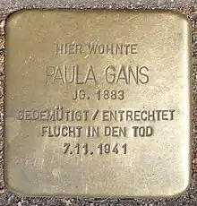 In November 1941, Paula and Richard Gans received the order to be deported to the Minsk Ghetto, scheduled for 8 November. The day before, on 7 November 1941, Paula Gans committed suicide.[2] Her brother was killed in Minsk in the same year. As a memento, two Stolpersteine were laid in front of their former home.