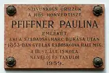 Commemorative plaque to Ms. Paulina Pfiffner (1825-1853) Honved officer during the 1848-49 war of independence. The plate is affixed to the front of the building in which she was held by the Austrian gendarme in 1953. (Gyula, Kossuth Lajos Street Nr 36)