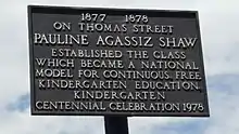 She died of bronchial pneumonia on February 10, 1917, at her home in Jamaica Plain.[6] She is memorialized at two different sites on the Boston Women's Heritage Trail, one on the North End Walk and another on the Jamaica Plain walk.[1] The Pauline Agassiz Shaw Elementary School in Boston is named in her honor.[7] She is featured on two walks given by the Jamaica Plain Historical Society. The Monument Square tour which passes the plaque memorializing one of her first kindergartens and the Jamaica Pond tour which passes her home on the shores of the Pond.