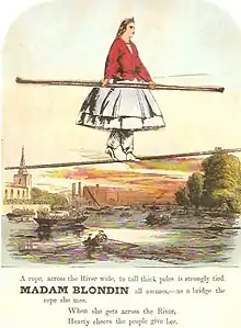 Edward Tyrrel Smith paid her to attempt to cross the Thames in Albanian costume on 12 August 1861. A wire that was too slack meant that she failed at the first attempt but she succeeded at her second try.[1] She walked from Battersea Bridge to the Cremorne Gardens watched by 20,000 people.[2] The Illustrated London News carried an engraving showing the number of boats that came out to observe the spectacle. She was advertised as Madam Blondin.[1]