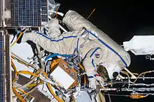 On 2 June 2006 Vinogradov performed his sixth career spacewalk. Vinogradov and NASA astronaut Jeffrey Williams spent six hours and 31 minutes making repairs and collecting experiments along the space station's exterior. Their excursion lasted almost an hour longer than planned after the astronauts fell behind in their work schedule.[9] The two spacewalkers began their spacewalk at 22:48 GMT, when they stepped outside the Pirs docking compartment airlock. The spacewalking duo completed two key ISS repairs. Vinogradov replaced a clogged vent nozzle used to dump excess hydrogen overboard by the space station's Elektron oxygen generator. Vinogradov and Williams also replaced a broken video camera that provides key views from the space station's railcar-like Mobile Base System. During the spacewalk, Vinogradov watched a foot restraint adapter, which had previously linked him to the station's Strela crane, drift off into space. The spacewalk ended at 1:19 a.m. EDT when the two spacewalkers re-entered the airlock of the Pirs docking compartment.[10]
