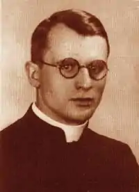 Paweł Kontny SChr (29 June 1910 – 1 February 1945) was a Polish priest of the Roman Catholic Church. He was a member of the Society of Christ. During World War II he served as a priest in Lędziny. On 1 February 1945, he was killed by Soviet soldiers while protecting two girls from being kidnapped and raped.[1] The Soviets forced the townspeople to bury Kontny's body in the place where he was killed.[2][3] Three days later, after the front moved west, the townspeople exhumed Kontny's remains and buried them at the local cemetery.[4][5][6][7] A cause for his beatification is currently being prepared.[8][9]