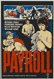 Payroll is a British neo-noir crime thriller film released in 1961. Directed by Sidney Hayers, the movie features Michael Craig, Françoise Prévost, and Billie Whitelaw in leading roles. The screenplay, written by George Baxt was adapted from Derek Bickerton's 1959 novel of the same name. The film revolves around a group of criminals who plan and execute a wages robbery, which ultimately ends in disaster.