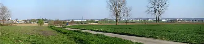 Tremblay-en-France: on the left the old village, with fields under cultivation; on the right in the distance modern housing estates and Charles de Gaulle Airport