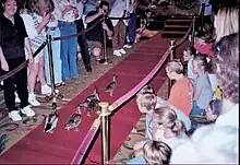 In 1940, a bellman by the name of Edward Pembroke volunteered to care for the ducks. Pembroke was given the position of "Duckmaster" and served in that position until 1991. As a former circus animal trainer, he taught the ducks to march into the hotel lobby, which started the famous Peabody Duck March.[1] Every day at 11:00 a.m., the Peabody Ducks are escorted from their penthouse home, on the Rooftop, to the lobby via elevator. The ducks, accompanied by the King Cotton March by John Philip Sousa, then proceed across a red carpet to the hotel fountain, made of a solid block of Italian travertine marble. The ducks are then ceremoniously led back to their penthouse at 5:00 p.m.[8]