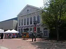 The East India Marine Hall was built in 1824–25 for the East India Marine Society to house its collection. Design of the building has most recently been ascribed to Thomas Waldron Sumner. It stands on the south side of Essex Street and is now integrated into the body of the Peabody Essex Museum. As built, it was a two-story structure, faced in granite on the front (Essex Street facade), and brick on the sides, measuring about 45 by 100 feet (14 m × 30 m). The main facade has been preserved; it has six rectangular bays on the main floor and seven tall round-arch windows on the second level. The gable pediment is fully enclosed, with a round window in the tympanum.[14]