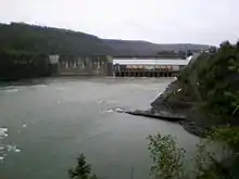 The Peace Canyon Dam is a large hydroelectric dam on the Peace River in northern British Columbia, Canada. It is located 6 km (4 mi) southwest of Hudson's Hope, 23 km (14 mi) downstream from the W.A.C. Bennett Dam.