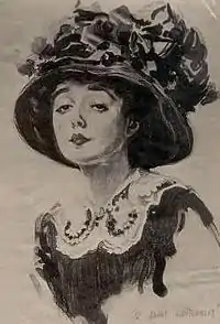 The name peach basket hat became popularly used around 1908 in the United States. An advertisement in the Pittsburgh Gazette describes "the new Peach Basket Hats", also showing an illustration of a flower-decorated straw hat in the shape of a basket.[3] While the term peach basket does not appear to have been used in the British fashion press, descriptions involving fruit baskets were. A 1908 comment piece in The Guardian by Evelyn Sharp described a variety of oversized designs, including one similar to Roundhead headgear, noting that they were: "hideously popular" and came trimmed with a variety of flower, fruit and bird motifs. Sharp added: "A basket of market produce pinned on the head would have much the same effect. For next to the difficulty of finding the head of the wearer underneath the hat of to-day comes the difficulty of finding hat shape under the trimming of to-day".[4]