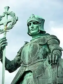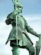 The memorial features a 2.1 m (6 ft 11 in) high bronze statue by George Frampton depicting Saint George in medieval armour, standing on a slain dragon. Saint George is raising the hilt of his sword in his left hand to form a cross, encircled by a wreath, and resting his left hand on a shield which bears Saint George's Cross. The cast bears the name and date "GEO. FRAMPTON RA / 1919".