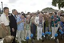 A dinner of the group on December 7, 1960, led to the first Pearl Harbor Survivors Association National Reunion at the Disneyland Hotel in Anaheim, California where over 300 survivors joined in commemoration of the event on December 7, 1961. President John F. Kennedy sent his personal representative to this convention. Over 1,000 survivors attended the PHSA National Reunion held at the Lafayette Hotel in Long Beach, California on December 7–8, 1962. At this meeting, the Pearl Harbor Survivors Association constitution was presented and ratified by the members. Mark Ferris, who initiated the group's first meeting in 1954, after visiting a reunion held for members of the battleship USS West Virginia (BB-48), was chosen as the PHSA's first national president.[3] Also, an official PHSA prayer to be said at association reunions was adopted. In October 1964, the PHSA issued its first quarterly newsletter to its members named the Pearl Harbor-Gram.[4] After the national reunion was held in Hawaii, December 4–10, 1966 in honor of the 25th anniversary of the attack on Pearl Harbor, the national reunion was to be held bi-annually on even numbered years only (the state chapters reunions would be on the odd number years).[5]