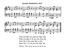 "Pease Porridge Hot" or "Pease Pudding Hot" is a children's singing game and nursery rhyme. It has a Roud Folk Song Index number of 19631.[2]
