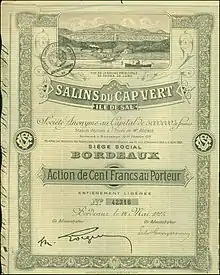 Pedra de Lume was founded by Manuel António Martins, who started the exploitation of the salt ponds in 1796.[6] A tunnel to the salt ponds was constructed in 1804, and a port in 1805.[7] Salt production flourished in most of the 19th century, but went into decline after 1887, when Brazil, the main export destination, imposed a ban on imported salt.[6] Salt production was revived by the French company Salins du Cap Vert, that installed an 1100 m aerial tramway for salt transport in 1921. Current production is small, and mainly intended for beauty products and thalassotherapy.[6]
