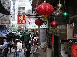 Wai Siu-pak, founder of Yee Tin Tong pharmacy, once lived in Wise Mansion, a large house at the top of Peel Street next to Robinson Road. The section of Peel Street between Hollywood Road and Staunton Street was known for its calligraphers specialised in making signboards in the 1950s and 1960s.[2] The part below Hollywood Road was well known for its Indian curry restaurants. However, expensive rents have driven these trades out of the area, which is now populated by modern tower blocks. The century-old Graham Street market is situated at the lower reaches of Peel Street.[2]