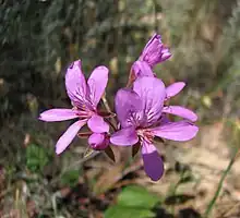 Pelargonium rodneyanum, commonly known as magenta storksbill, is a perennial herb species that is endemic to Australia. It grows to 40 cm high and has leaves with 5 to 7 shallow lobes.[2] Dark pink flowers appear between October and February in the species native range.[3]