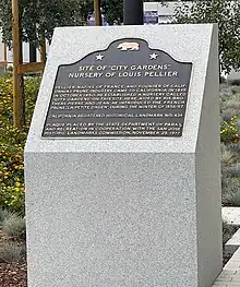 - 1 2 3 4 5 "Site of City Gardens-Nursery of Louis Pellier". Office of Historic Preservation. San Jose, California. March 16, 1949. Retrieved October 8, 2023.