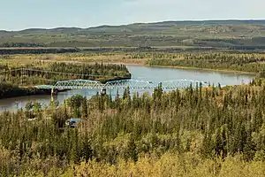One of two major headwaters of the Yukon River (the other is the Stewart River), the Pelly River's drainage basin, measured above the town of Pelly Crossing, is 49,000 km2 (19,000 sq mi) in size. It drains a large part of the sparsely-populated Yukon Plateau of the central Yukon west of the Mackenzie Mountains. The Tintina Trench, which the majority of the river's waters flow in, is the northernmost extension of the Rocky Mountain Trench, which stretches well south to British Columbia. The river is navigable by small and medium-sized craft for over 320 km (200 mi), from its mouth to Hoole Rapids, except for a shallow stretch of the river in Bradens Canyon.[3] The Yukon communities of Ross River, Faro and Pelly Crossing are all on the Pelly River. There are bridges across the Pelly in Pelly Crossing (where it crosses the Klondike Highway) and in Faro, as well as a cable ferry at Ross River on the Canol Road.