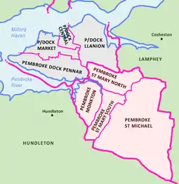 ![]() Pre-2022 ward locations within the towns of Pembroke and Pembroke Dock | |