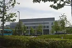 A new hospital was procured under a Private Finance Initiative contract to replace both the Pembury County Hospital and the Kent and Sussex Hospital. The new hospital was designed by Anshen & Allen[4] and built by Laing O'Rourke at a cost of £230 million.[5] The first phase of the new hospital, on which construction started in 2008, opened in January 2011; the rest of the hospital opened on 21 September 2011 at which time all services were transferred from the Kent and Sussex Hospital. The new hospital was denied a "Royal" prefix as though it serves Royal Tunbridge Wells, it is not located within the town's boundaries.[6] Facilities management services are provided by Interserve.[7]
