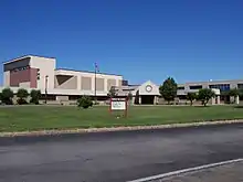 Due to this rapidly increasing population and school consolidation, a further expansion of the high school building on Five Mile Line Drive was approved in 1949.[30] Five and one half acres of land was acquired in the rear of the existing building.[31] The expansion added a gymnasium, expanded facilities, and a new 14 room elementary school in the rear of the building. The cost of the expansion was $565,000 (USD).[32] The expanded school building was designed for 800 students.[33] The old gymnasium was turned into an auditorium and the new addition included a double gymnasium.[34]