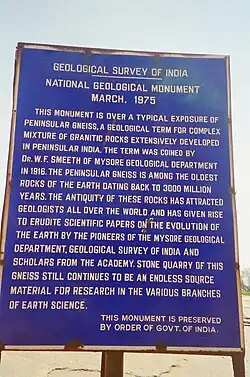 The Lalbagh hill, which has been declared as a Geological Monument (plaque pictured) to represent the Peninsular Gneiss, has dark biolite gneiss of granitic to granodioritic composition containing streaks of biolite. Remnants of older rocks are seen in the form of enclaves.[2] The research information of the geological record of the gneisses, collated and reported in the publication "Geological Monuments of India" published by the Geological Survey of India, is quoted below to provide an undiluted version.[3]