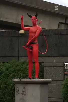 Penis Satan, also called East Van Satan, was an unauthorized statue erected on September 9, 2014, in Vancouver, Canada.[1] A life-size representation of a red devil with a large erect penis, making the sign of the horns hand gesture, the statue was erected in Clark Drive Plaza, an abandoned concrete amphitheater on the west side of Clark Drive at Grandview Highway North. It was made of mixed materials, including a modified mannequin, and was placed on an empty pedestal[2] that previously displayed a three-foot-tall Christopher Columbus statue (honouring Angelo Branca).[3] Vancouver commuters were able to see the statue from the Expo Line of the SkyTrain,[4] near the East Van Cross, which is located on the opposite side of the tracks.