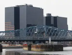 Penn Plaza East is an office building complex located near Penn Station in Newark, New Jersey. Fronting Raymond Boulevard on the banks of the Passaic River, the two office building complex were constructed during a period in the late 1980s and early 1990s when they and numerous postmodern skyscrapers were built near the station and Gateway Center. While others went up between the station and traditional Downtown Newark, Penn Plaza East is on the Ironbound, or east, side of the major transportation hub.[6] The two towers sit above a four-story parking facility and lobby that joins them. An additional parking area in the shadow of the Dock Bridge will be developed as part Newark Riverfront Park a promenade along the banks of the Passaic River.[7][8]