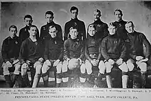Fielding a 14-man roster and being coached by a student manager the Nittany Lions set off for Philadelphia to debut in December 1911.[11] Lacking university funds for the trip equipment and trip costs were paid with a $100 (equivalent to $3,032 in 2022) donation from Penn State alumnus James G. White.[12] The Nittany Lions played their inaugural match on December 19, 1911, against the previous year's national champion Haverford College, the squad fell 3–2. The team finished the road series drawing their matches against Westtown School 1–1 on December 20 and University of Pennsylvania 0–0 on December 21.[13]