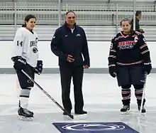 Lady Ice Lions captain Carly Szyszko and Liberty captain Rena Leone take a ceremonial faceoff from Penn State Assistant Athletic Director Joe Battista at the first intercollegiate hockey game in Pegula Ice Arena on September 27, 2013
