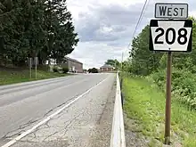Pennsylvania Route 208 (PA 208) is located in Western Pennsylvania; its western terminus just west of the village of New Bedford in Lawrence County (11.5 miles northwest of New Castle) at U.S. Route 422 (US 422) and the Ohio state line. It runs nearly 75 miles (121 km) to its eastern terminus in the village of Frills Corners in Clarion County (22 miles east of Oil City) at PA 36.