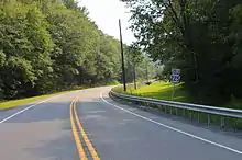 PA 225 begins at an interchange with the US 22/US 322 freeway in Middle Paxton Township, Dauphin County, heading east on Peters Mountain Road, a four-lane divided highway. The route soon becomes a two-lane undivided road and runs through wooded areas with some residences. The road briefly enters the borough of Dauphin, where it turns north back into Middle Paxton Township and heads through rural areas of homes. PA 225 turns to the northwest and intersects PA 325, at which point that route comes from the east to turn north and form a concurrency with PA 225. The road passes through woods before heading into agricultural areas, with PA 325 splitting to the west. Past this, the route turns northeast to ascend forested Peters Mountain. At the summit, the road heads into Halifax Township and passes under a bridge carrying the Appalachian Trail, making a hairpin turn to the west to descend the mountain. PA 225 makes another hairpin turn to the northeast before turning north and coming into a valley containing agricultural areas with a few homes. The route runs north-northeast before passing through the residential communities of Powells Valley and Matamoras, heading more to the north at this point. PA 225 turns northeast again and intersects PA 147, at which point that route turns northeast to join PA 225. The road gains a center left-turn lane and heads north through rural areas of homes and businesses. The two routes continue into the borough of Halifax and become South 4th Street, losing the center left-turn lane and passing several homes. PA 147 splits from PA 225 by heading west on Market Street, and PA 225 continues north on North 4th Street. The route turns east onto Armstrong Street, passing more residences and some businesses.[2][3]