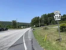 Pennsylvania Route 234 (PA 234) is a 38-mile-long (61 km) state highway located in Adams and York Counties in Pennsylvania. The western terminus is at U.S. Route 30 (US 30) in Franklin Township. The eastern terminus is at PA 462 in West York. PA 234 heads east from US 30 as a two-lane undivided road through rural areas in northern Adams County, passing through Arendtsville before it reaches Biglerville, where it intersects PA 394 and PA 34. The route continues east and has an interchange with the US 15 freeway in Heidlersburg and crosses PA 94 prior to reaching East Berlin, where it intersects PA 194. PA 234 crosses into York County and heads through rural areas in the western part of the county. Right before its eastern terminus at PA 462, PA 234 crosses US 30 on an overpass; however, there is no direct access to the highway. PA 234 was designated in 1928 between US 30 in Franklin Township and PA 194 in East Berlin. The route was extended east from East Berlin to US 30 (now PA 462) west of West York in 1937. The entire route was paved in the 1930s.